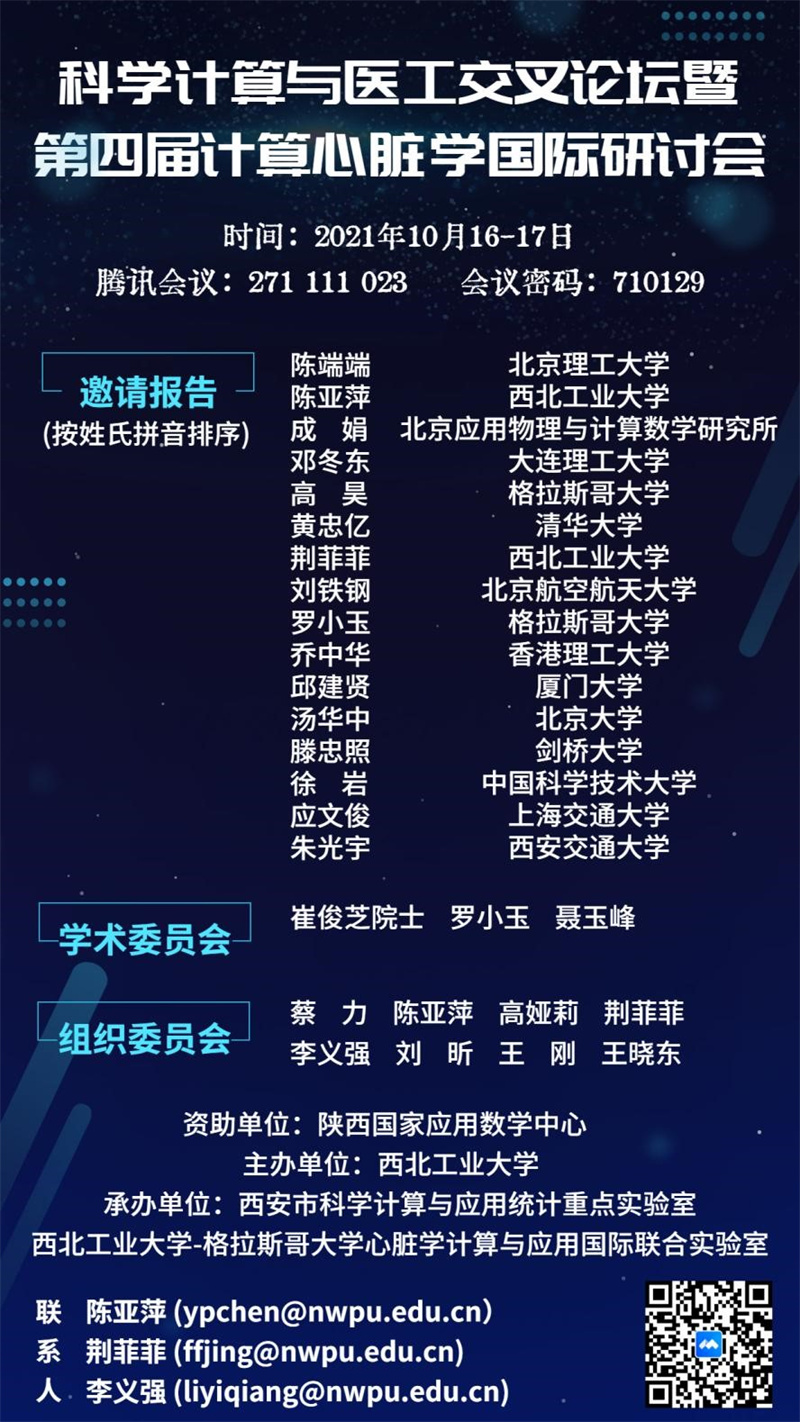 科学计算与医工交叉应用论坛暨第四届计算心脏学国际研讨会由陕西国家应用数学中心资助,伟德国际1949官方网站主办,西安市科学计算与应用统计重点实验室和伟德国际1949官方网站-格拉斯哥大学心脏学计算与应用国际联合实验室承办,将于2021年10月16日-17日线上举办。会议旨在汇聚海内外专家学者,搭建科学计算与生物医学工程的交流平台,聚焦相关学术前沿及研究热点,促进相关领域的交叉与融合。