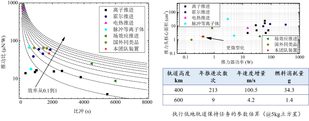 离子液体电推力器样机与其他推进方式实测数据比较