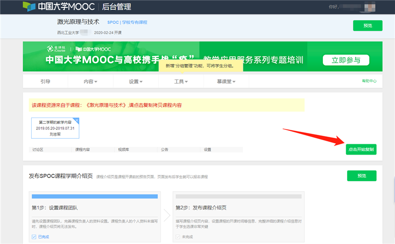 第六步:进入发布内容页面,按照引导操作,务必首先“点击开始复制”课程资源。复制完毕,老师们就可以对源课程的资源按照自己的教学设计进行修改了。
