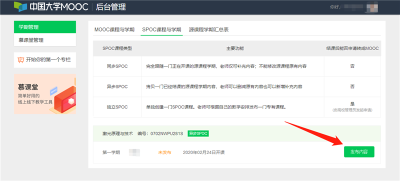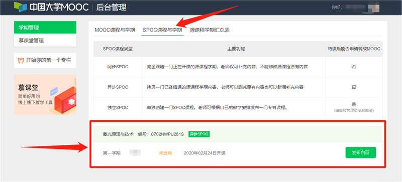 第四步:点击页面上方“SPOC课程与学期”,在下方即可查看到相应课程,也就是伟德管理员已经为对应老师建好的SPOC。