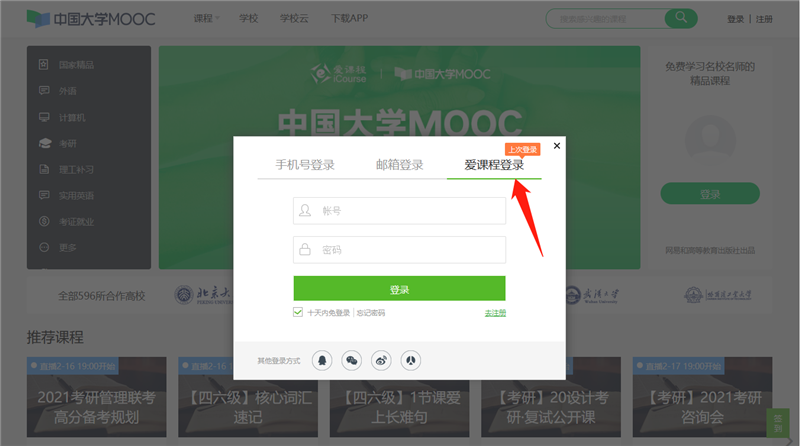 第二步:使用“爱课程登录”输入账号和密码进入页面。