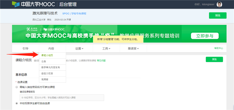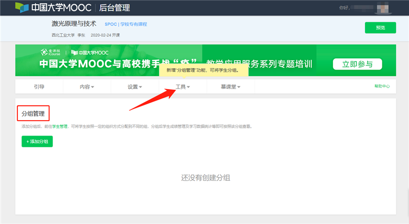 2.分组管理:进入“工具-分组管理”可对学生进行分组,便于管理学生的学习数据和成绩管理。当然,也可以将每个组视作一个班,这就是我们通常说的如果同一门课有多个课头有多个老师上课,而老师们协商可以放在一个SPOC里,多个老师作为课程团队成员分工管理。当然,也可以每个课头建一个SPOC,高校管理员就是根据不同课程组的老师们的需求为大家建对应数量的SPOC。需要注意的是,同一门课程无论多少个课头,请务必采用同样的考核模式。