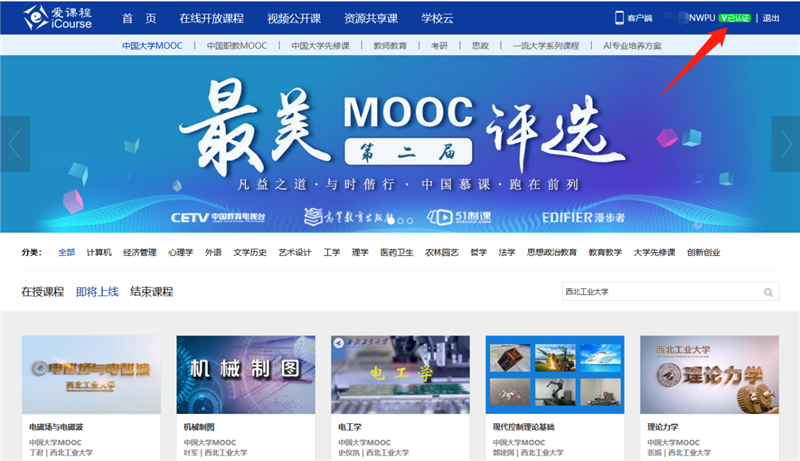 第一步:老师需确认自己的账号是否通过教师认证,如认证成功,页面右上方则会显示已认证。如果老师们没有完成认证,学校的管理员就没办法在平台上找到您,也就无法为您建SPOC。
