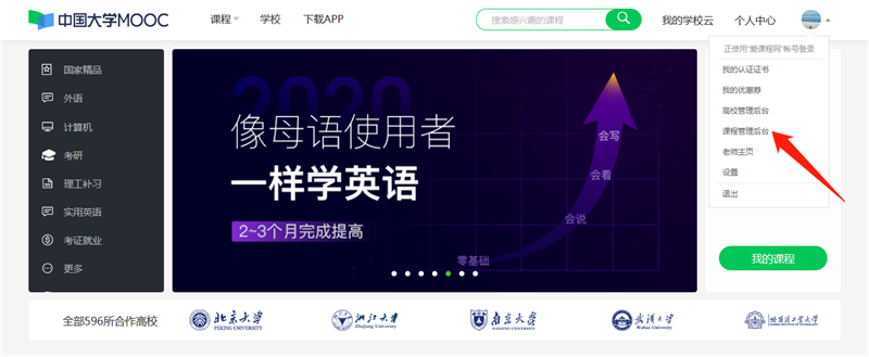 第三步:鼠标停放在页面右上方头像处,在弹出菜单栏点击“课程管理后台”进入。