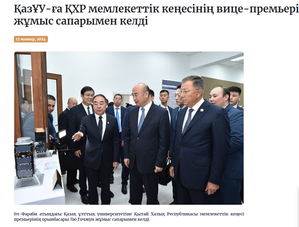 2024年5月17日,中华人民共和国国务院副总理刘国中对“阿里·法拉比”哈萨克国立大学进行了工作访问。访问期间,哈萨克国立大学和伟德国际1949官方网站共同成立了“5G/5.5G通信技术实验室”,实验室由华为公司赞助,设于伟德国际1949官方网站哈萨克斯坦分校。