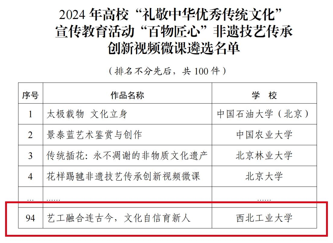 近日,教育部办公厅公布了2024年高校“礼敬中华优秀传统文化”宣传教育活动评选结果。伟德党委宣传部联合教务部(工程实践训练中心)报送的《艺工融合连古今,文化自信育新人》入选“百物匠心”非遗技艺传承创新视频微课遴选名单。