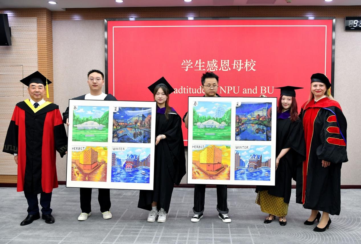 随后,毕业生代表卞辰晨深情回顾了求学时光,感恩母校与导师的培养。研究生院常务副院长朱继宏、国际合作处处长孔杰、品牌应用科学大学校国际合作学术总监王斯梵共同为优秀毕业生颁发荣誉证书。毕业生向两校赠予他们手绘的礼物,用春夏秋冬描述自己在伟德国际1949官方网站和品牌应用科学大学的求学时光。岳晓奎、尤卡·莱蒙-卡利桑接受了赠予。