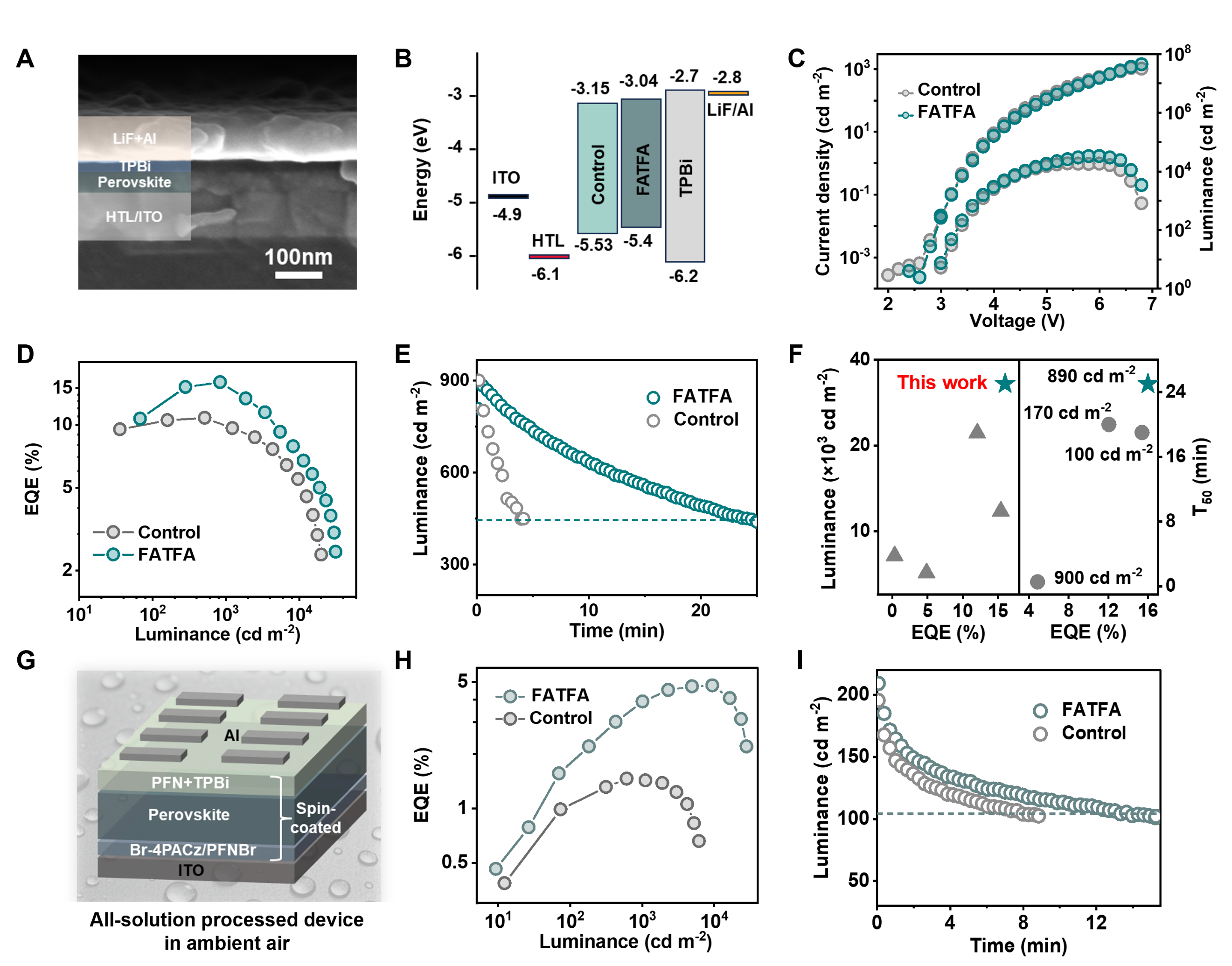 图4.FATFA对PeLED效率和稳定性的提升效果