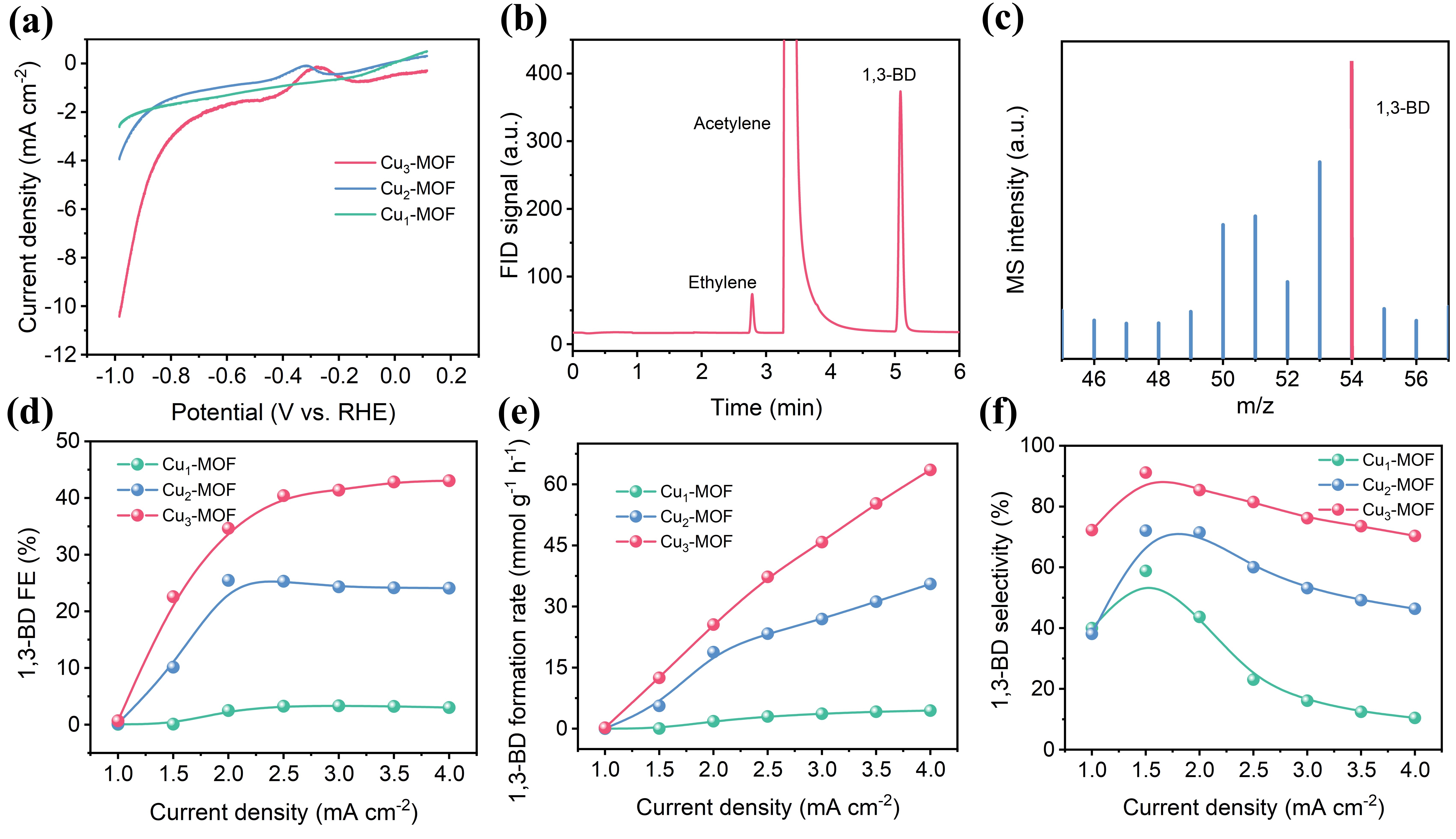 研究团队通过精准调控铜基MOF催化剂中铜位点的核数,系统对比了单核(Cu1-MOF)、双核(Cu2-MOF)及三核(Cu3-MOF)结构的催化性能。实验表明,单核Cu1-MOF因孤立铜位点的局限性,主要催化乙炔半氢化生成乙烯,其1,3-丁二烯选择性不足4%,产率仅为3 mmol g-1h-1;双核Cu2-MOF虽能部分促进C-C耦合,但中间体吸附强度不足,导致1,3-丁二烯选择性为25%,产率为34 mmol g-1h-1。而三核Cu3-MOF中邻近双铜位点的协同作用,显著优化了乙炔吸附(吸附能低至0.133 eV)、*C2H3中间体耦合及产物脱附过程(ΔG = -0.336 eV),最终在电流密度为4 mA cm-2时实现91%的1,3-丁二烯选择性和64 mmol g⁻¹ h⁻¹的高产率,性能远超单核与双核催化剂。