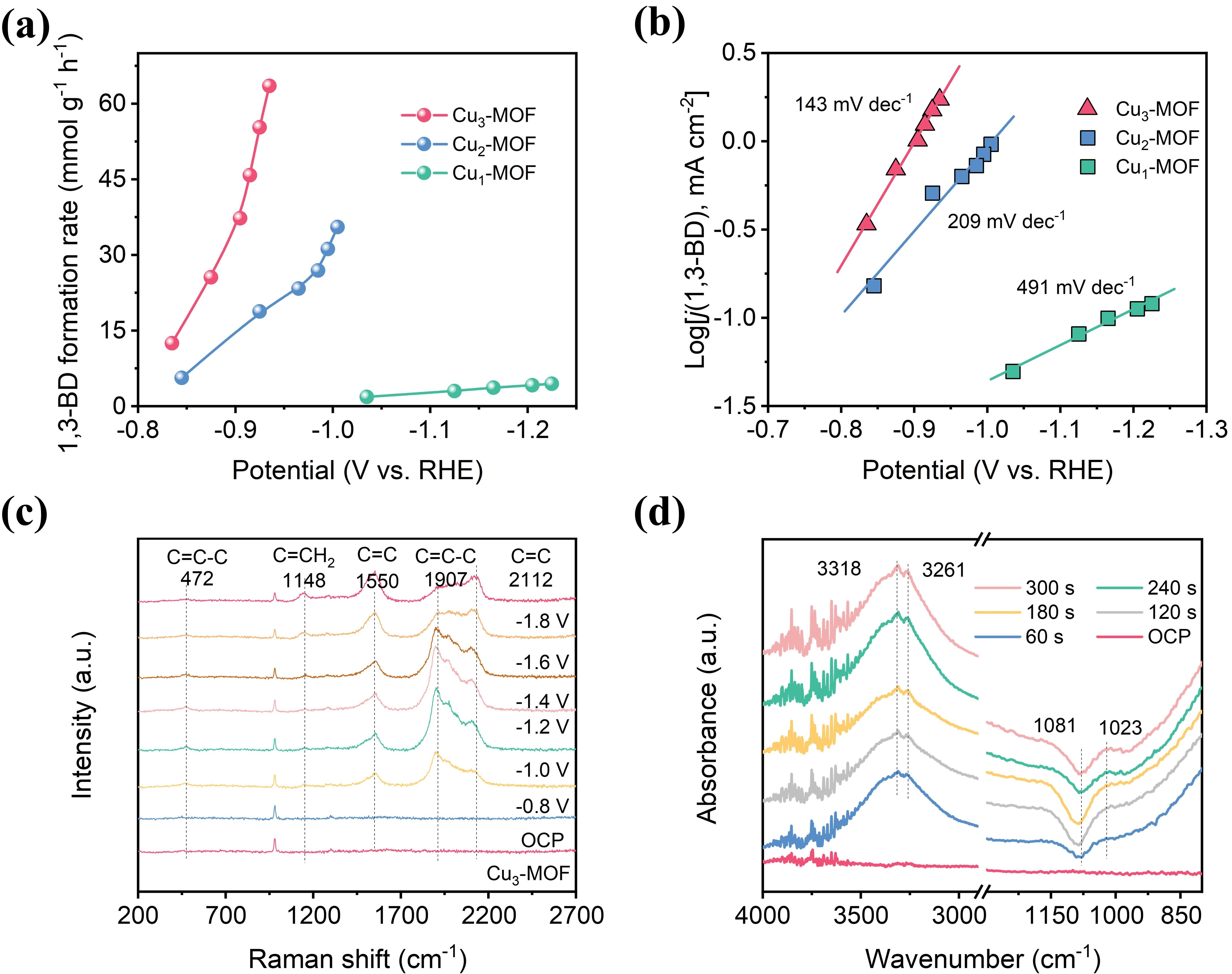图3.Cu3-MOF电催化乙炔制1,3-丁二烯原位电化学测试