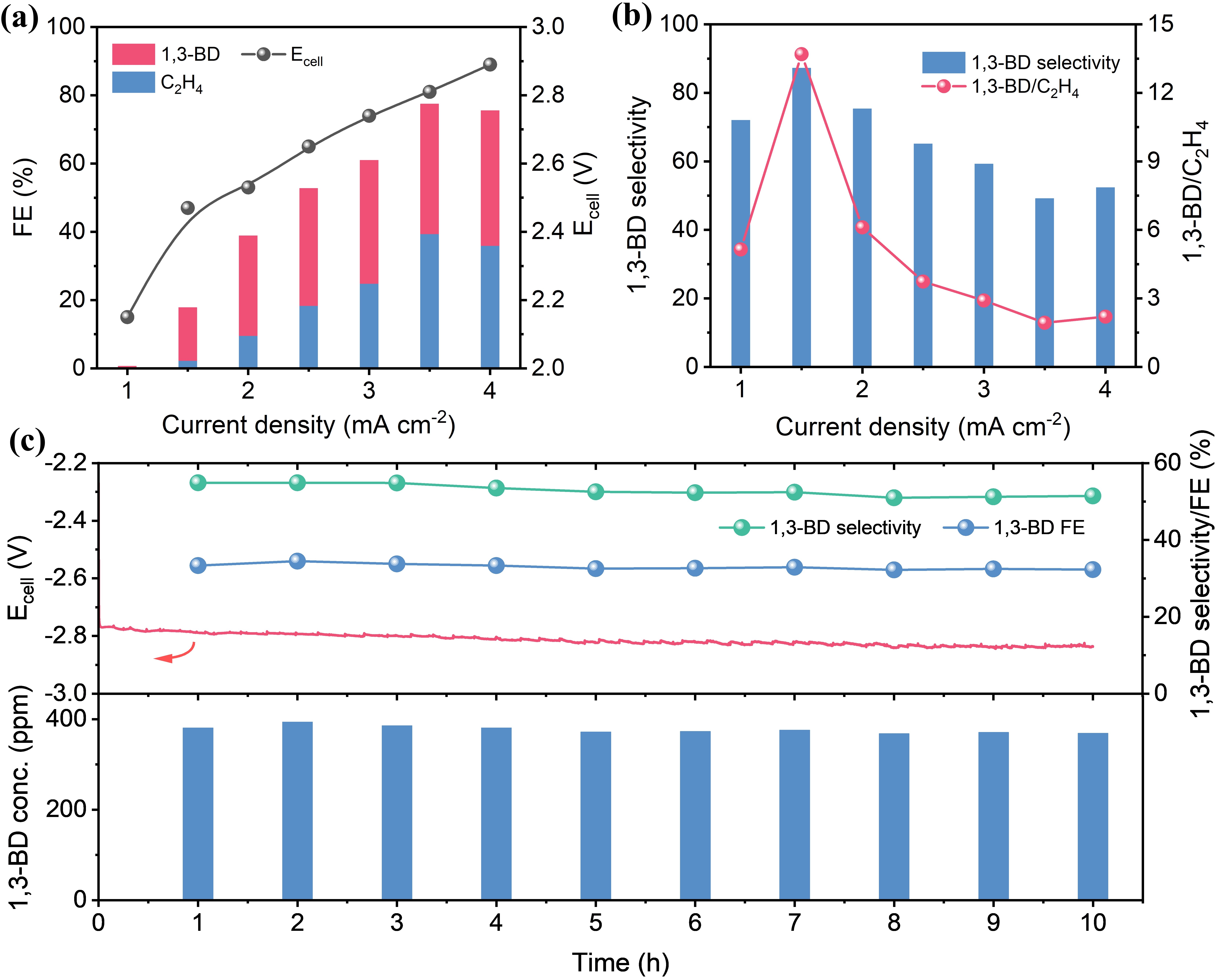 1,3-丁二烯是合成工程塑料(如ABS树脂)和合成橡胶(如顺丁橡胶)的核心单体,全球年需求量超1200万吨,且以每年约5%的速度增长。目前工业上主要通过石脑油裂解副产C4馏分提取1,3-丁二烯,但该工艺能耗高且面临原料供应短缺问题。电催化乙炔加氢二聚反应利用可再生电能,在温和条件下即可将乙炔直接转化为1,3-丁二烯,是极具潜力的替代路线。然而,该反应长期受限于乙炔半氢化生成乙烯的副反应及低选择性(≤20%)的挑战。