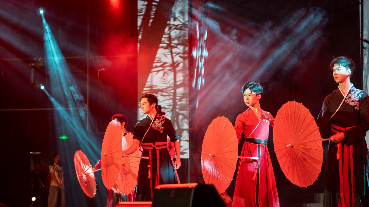舞蹈《能不忆江南》以轻盈的舞姿勾勒出山水的温婉秀丽,2025级新生代表带来的歌曲串烧《闪耀的我们》,用歌声唱出了新同学们对大学生活的憧憬与期待,国际教育学院留学生带来一曲《Sway》展现多元文化的融合之美,随后民乐合奏《霜剑鸣》弦音铮铮尽显少年意气风华。