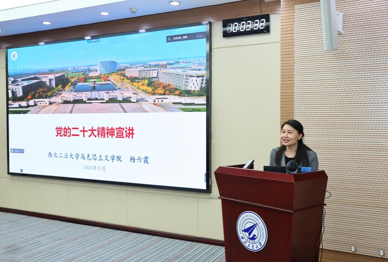 报告中,杨云霞教授紧扣党的二十大报告原文,从党的二十大的主题及主要成果、过去五年的工作和新时代十年的伟大变革、马克思主义中国化时代化、中国式现代化、全面建设社会主义现代化国家的目标任务、坚持党的全面领导和全面从严治党、应对风险挑战等七个方面,用丰富的案例和详实的数据,对党的二十大报告进行了全面系统的宣讲和深入阐释,并结合工作实际,为与会师生围绕党的二十大精神开展理论研究工作提供了指导,宣讲脉络清晰、内容丰富、重点突出。杨云霞表示,要认真学习领会党的二十大精神,紧密团结在以习近平同志为核心的党中央周围,高举中国特色社会主义伟大旗帜,全面贯彻习近平新时代中国特色社会主义思想,以更加强烈的历史自觉和主动精神,为全面建设社会主义现代化国家、全面推进中华民族伟大复兴而团结奋斗。