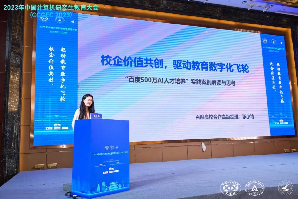 百度集团校企合作部高级经理张小诗作了题为《校企价值共创,驱动教育数字化飞轮》的报告,介绍了百度AI人才培养的实践案例,通过提供资金支持、与高校共建课程体系、举办高校师资培训班及各类AI竞赛等措施,来实现提升AI人才培养水平的战略目标。