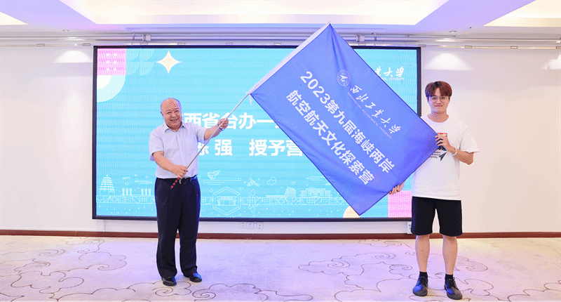 陕西省台办一级巡视员陈强为第九届海峡两岸航空航天文化探索营授旗并宣布开营。