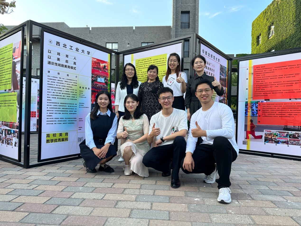伟德参与本次直播活动师生在学校美育案例前合影