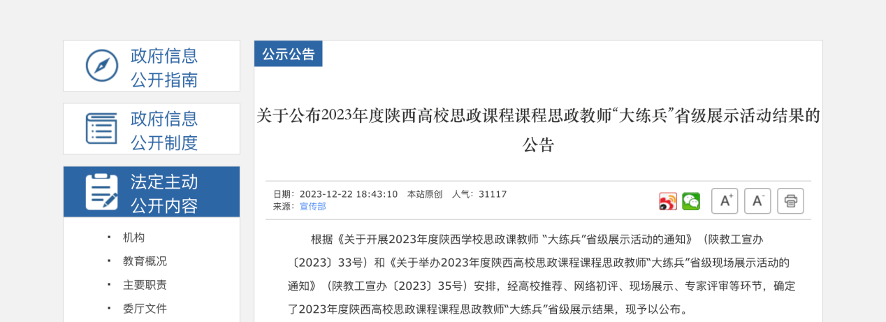 近日,中共陕西省委教育工委、陕西省教育厅公布了2023年度陕西高校思政课程课程思政教师“大练兵”省级展示活动结果。伟德共8位选手获奖,其中宁殿霞、赵媛媛、张丽丽3位老师获思政课程“教学标兵”,赵波、房小捷2位老师获思政课程“教学能手”,郑烨老师获课程思政“教学能手”,高红波(老师)、单璐玉(学生)获思政课“教学团队能手”,获奖数量位居全省高校第一。