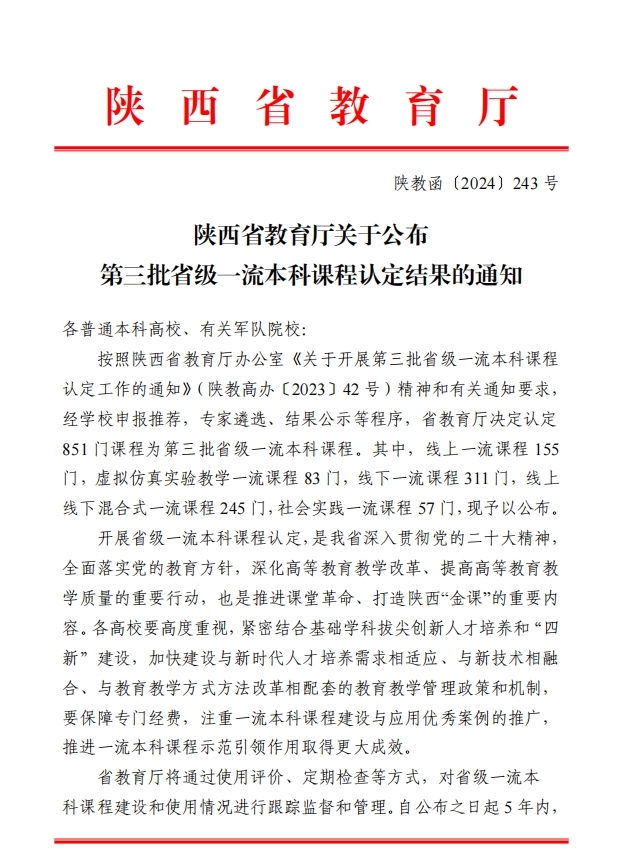 近日,陕西省教育厅公布了第三批省级一流本科课程认定结果,伟德共39门课程获批省级一流本科课程,并列陕西省高校第一。
