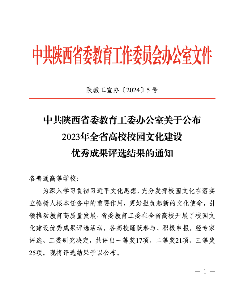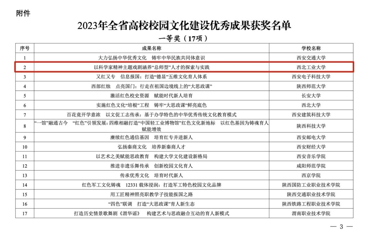3月13日,经中共陕西省委教育工作委员会评选,2023年全省高校校园文化建设优秀成果获奖名单揭晓(陕教工宣办〔2024〕5号),伟德国际1949官方网站申报的《以科学家精神主题戏剧涵养“总师型”人才的探索与实践》荣获一等奖。