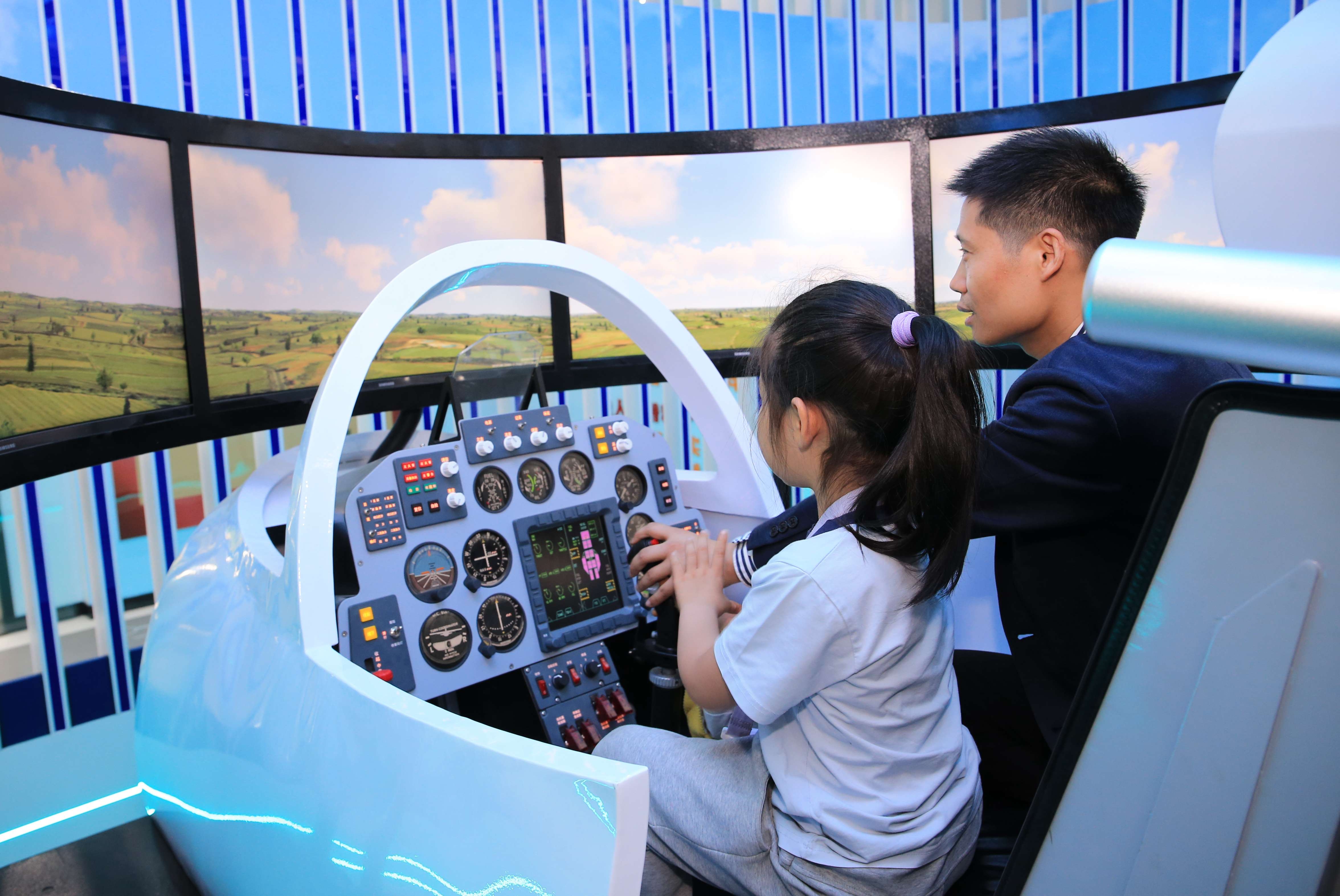 听志愿者爸爸讲述飞行的故事,近距离观看和触摸各种飞机模型和系列无人机,在虚拟驾驶模拟舱中体验,感受驾驶飞机在天空翱翔的感觉,种下一颗颗充满希望的航空梦。
