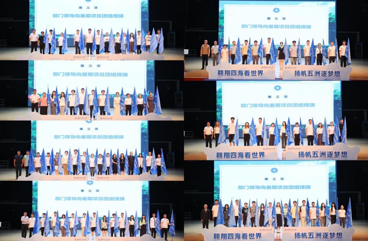 他分别为党委学工部、航空学院、微电子学院、数学与统计学院、教育实验学院、体育部、外国语学院负责人授予2024年“翱翔四海”七大主题旗帜。各部门负责同志为暑期项目团队代表授予项目团旗。
