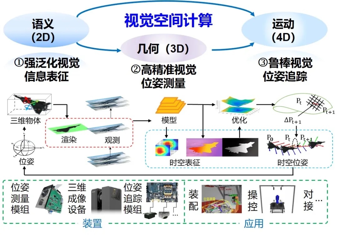 项目发明了强泛化视觉信息表征技术、高精准视觉位姿测量方法与鲁棒视觉位姿追踪技术,构建了高效、可扩展、跨平台的视觉空间计算装置与系统,解决场景目标“是什么”“在哪里”“往哪去”三个核心问题。成果已在高精度工业视觉引导装配、移动终端视觉感知与交互、无人系统空中引导交互等领域形成规模化应用,经济与社会效益显著,推广应用前景广阔。