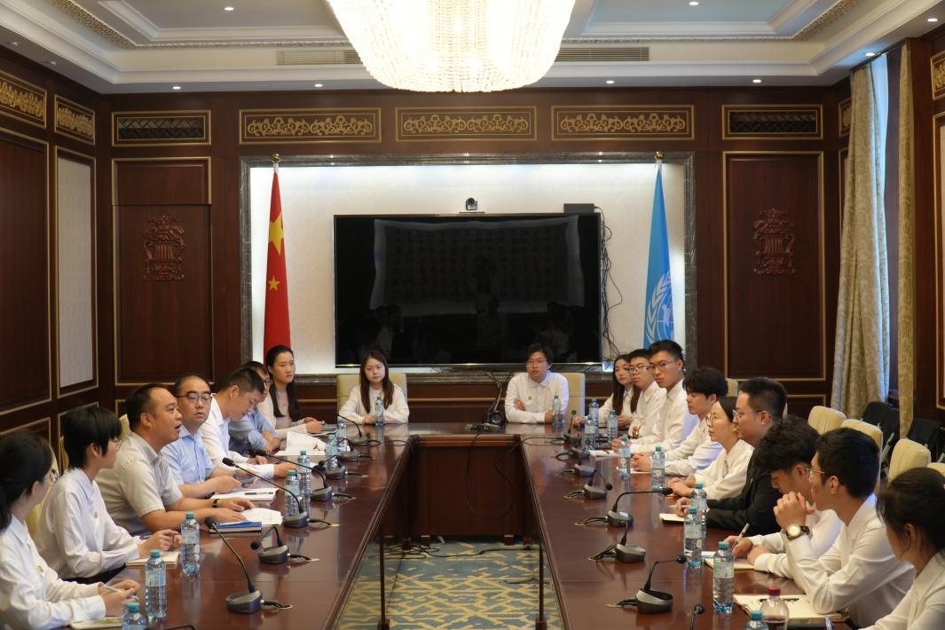 铸剑班参访了中华人民共和国常驻维也纳联合国和其它国际组织代表团,李松大使、沈钢公使衔参赞携相关处室外交官代表与师生们进行了亲切交流。李松大使寄语同学们树立远大理想,锤炼品德修为,通过参访更加全面深入地了解中国特色大国外交,更好更快成长,报效祖国,勇于担当新时代中国青年的使命责任。各位外交官详细介绍了代表团在维也纳多边平台积极致力于推动构建人类命运共同体、落实全球发展倡议、全球安全倡议、全球文明倡议所开展的工作,并就同学们提出的人类命运共同体理念下的多边主义维护和践行、中国推动联合国2030可持续发展议程的具体举措、青年学生国际化视野和全球胜任力培养等问题进行了详细解答。通过参访进一步加深了师生们对祖国外交事业认识和理解,深切感受到了新时代中国特色大国外交的风采与担当。