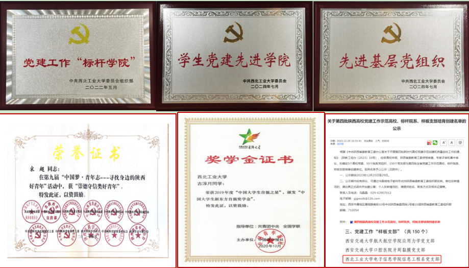 五年来,学院荣获校级党建工作“标杆学院”,校级“学生党建先进学院”3次,获批党建工作“样板支部”省级1个、校级3个,校级“双带头人”支部书记工作室1个,“三创三力”样板学生党支部3个。学院师生获评校级及以上优秀党员、优秀党务工作者、学生党员标兵等荣誉称号13人次,涌现出“中国大学生自强之星”“陕西青年五四奖章”“陕西好青年”等先进个人。