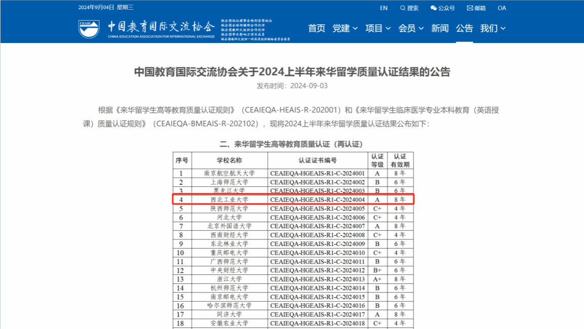 9月3日,中国教育国际交流协会发布关于2024上半年来华留学质量认证结果的公告。伟德顺利通过来华留学生高等教育质量认证(再认证),获得认证最高等级“A级”,认证有效期为8年,也是西部首家获评A级高校。