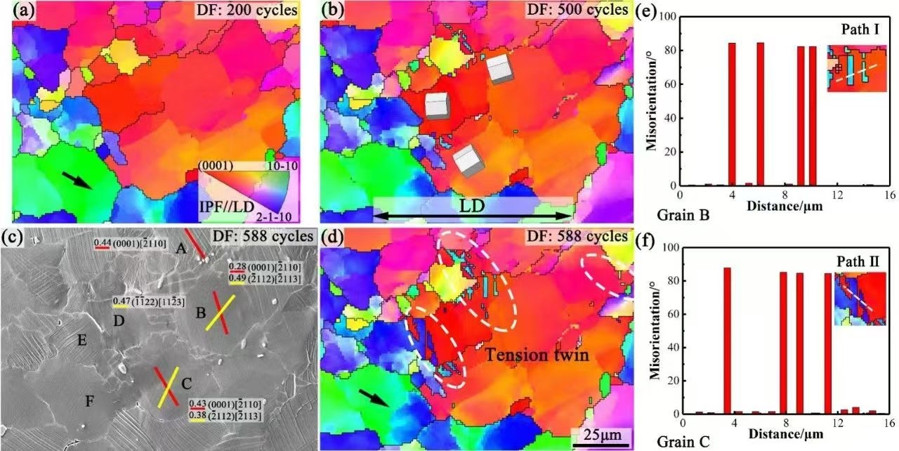 图2. SEM-EBSD IPF//LD (a-d)显示了MTR样品原位保载过程中{10-12}孪晶的形核长大,(e)和(f) 图(d)中沿路径Ⅰ和Ⅱ的取向差分布。