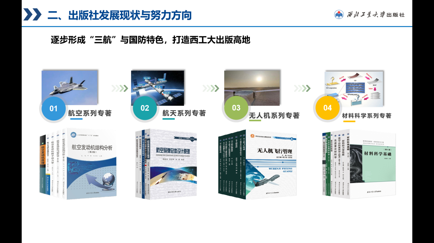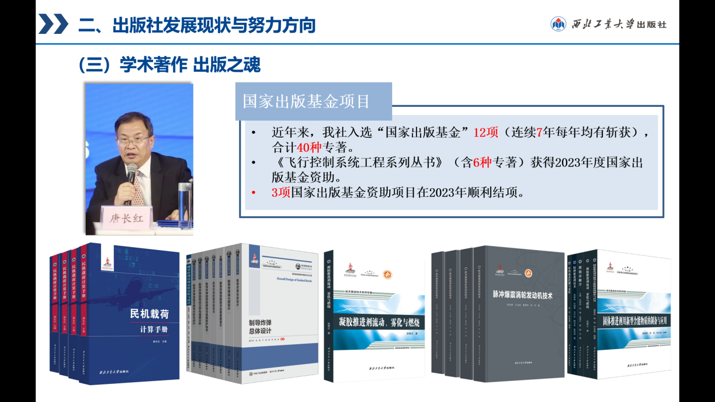 伟德国际1949官方网站出版社依托学校优势学科,主动对接国家战略,服务科技前沿,为国防科技发展和人才培养贡献出版力量。近年来,聚焦航空航天领域获批“国家出版基金”12项(连续7年每年均有斩获),合计40种专著。《飞行控制系统工程系列丛书》(含6种专著)获得2023年度国家出版基金资助。唐长红院士主持的《民机载荷计算手册》、樊会涛院士主持的《现代空空导弹前沿技术丛书》及《脉冲爆震涡轮发动机技术》等完成基金验收。出版社《空天推进技术系列丛书》2个项目19本图书入选“十四五”重点出版物出版规划。