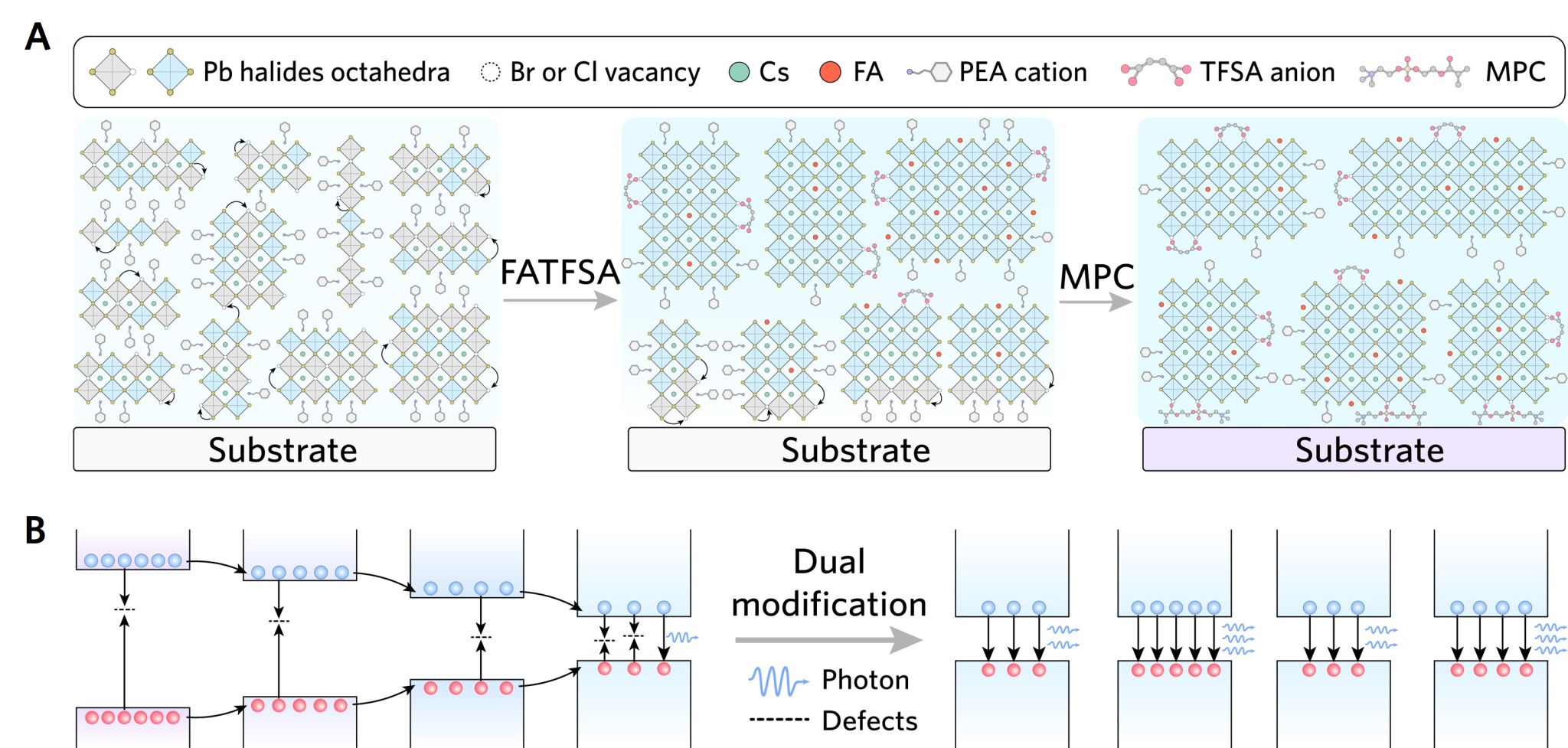 图4. 通过四氟丁二酸甲脒和双亲性分子双重修饰使能量分布均匀化的示意图。