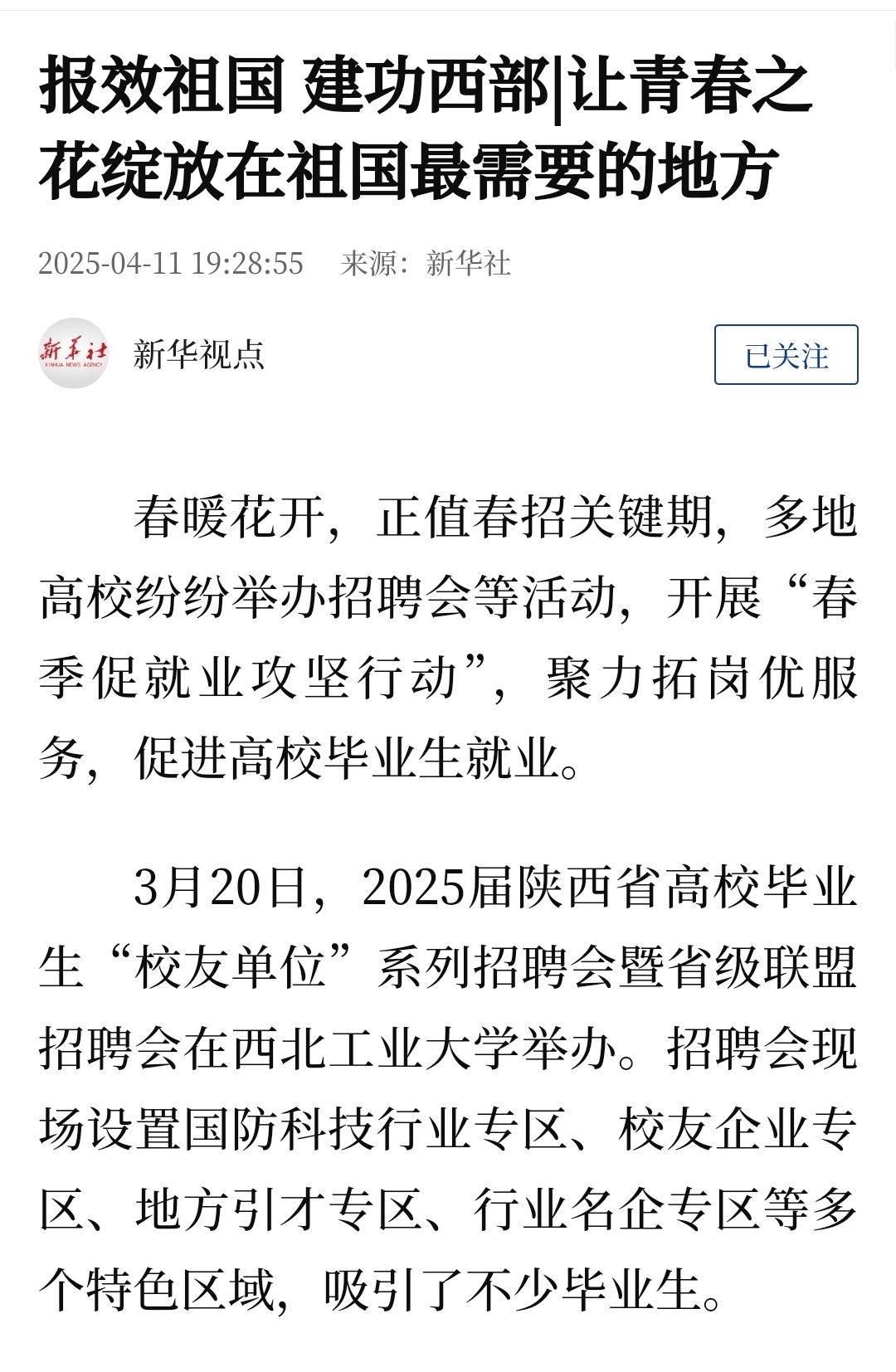 4月11日,新华社刊发重点报道《报效祖国 建功西部|让青春之花绽放在祖国最需要的地方》。文章对伟德学子扎根西部、献身国防的事迹进行了重点报道。
