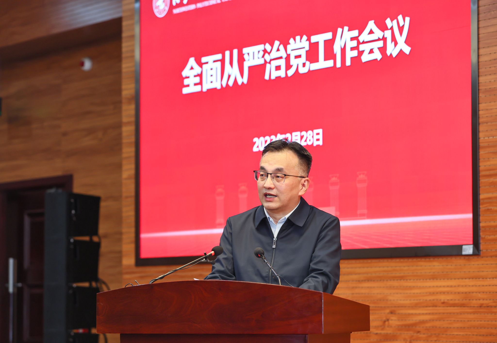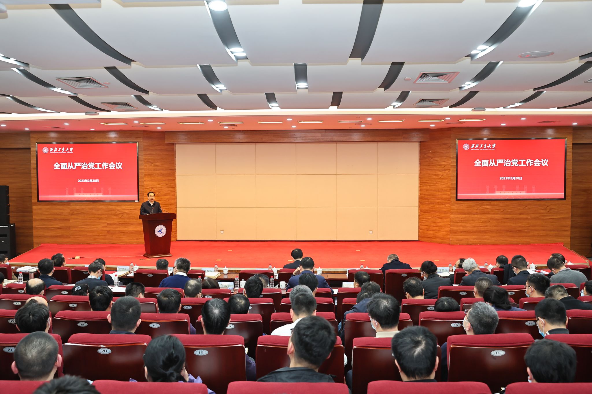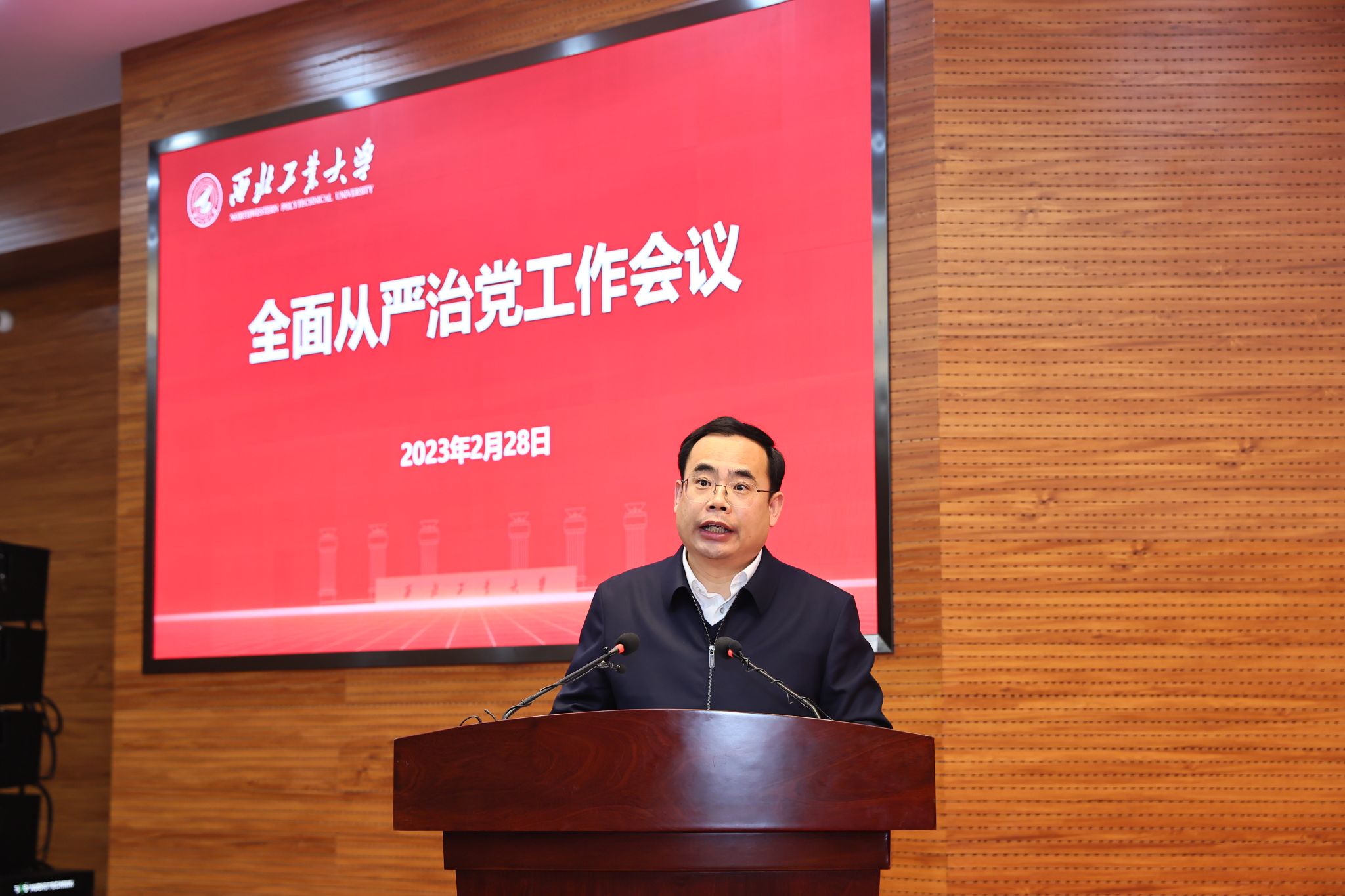 党委书记李言荣在讲话中,全面总结了过去一年学校全面从严治党工作,对做好2023年全面从严治党工作作出部署。他指出,今年,学校将坚持以习近平新时代中国特色社会主义思想为指导,全面贯彻落实党的二十大和中纪委二次全会精神,认真落实新时代党的建设总要求,全面落实管党治党政治责任,推动全面从严治党向纵深发展,努力为学校高质量发展提供更加坚实的保障。他强调,要重点做好“五个坚持”,一是坚持把政治建设摆在首位,坚定拥护“两个确立”,坚决做到“两个维护”。进一步加强党的全面领导,高质量开展政治监督和政治巡视,着力推动学校党建与事业发展深度融合。二是坚持用党的创新理论凝心铸魂,牢固坚定理想信念。强化新时代党的创新理论武装,完善“国防底色、工信特色”思政工作体系,加强学生思想政治工作引领,严格落实意识形态工作责任制。三是坚持大抓基层的鲜明导向,构建高质量组织工作体系。加快建设高素质专业化干部队伍,着力加强基层党组织建设,全面提升基层党建工作质量。四是坚持以严的基调强化正风肃纪反腐,巩固发展良好校园政治生态。持续深化作风建设,严格执行党的纪律规定和规章制度,进一步强化管党治党责任履行。五是坚持贯通融合形成合力,不断完善学校监督体系。持续深化纪检监察体制改革,深化不敢腐、不能腐、不想腐一体推进,深入推进廉洁文化建设。