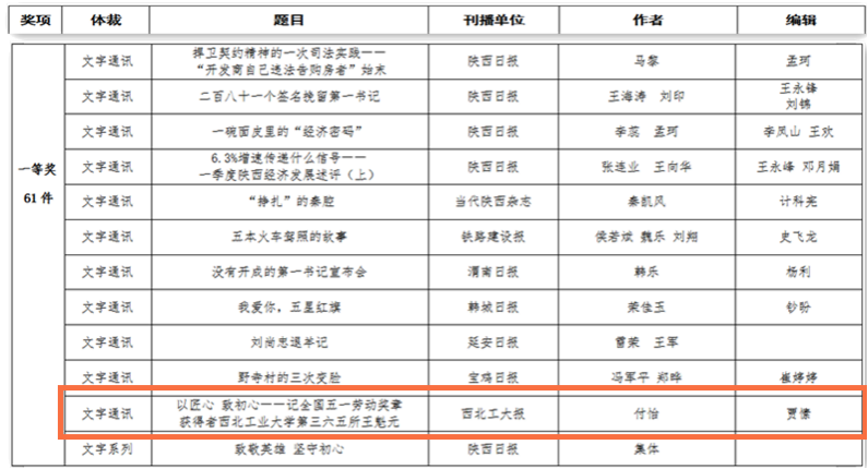 “陕西新闻奖”是陕西省新闻工作者协会设立的行业权威奖项,每年评选一次,是陕西省优秀新闻作品最高奖项。2019年度,陕西省共有272件新闻作品获奖,其中特别奖作品2件、一等奖作品61件、二等奖作品96件、三等奖作品113件,作品体裁涵盖文字通讯、电视专题、广播访谈、摄影、新闻版面、内参等多个类别。本次评选,全省高校系统共有12件新闻作品获奖,其中一等奖作品1件、二等奖作品4件、三等奖作品7件。