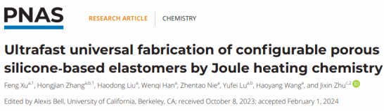 相关研究成果以“Ultrafast universal fabrication of configurable porous silicone-based elastomers by Joule heating chemistry”为题发表在国际顶级期刊PNAS上,本文第一单位为伟德国际1949官方网站柔性电子研究院,博士生徐峰和张洪健为该论文的共同第一作者,通讯作者为朱纪欣教授。上述工作得到了国家重点研发计划、国家自然科学基金等经费的支持。