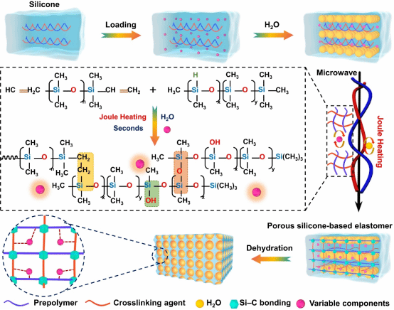 图1、焦耳热化学超快制备有机硅基柔性材料机理示意图