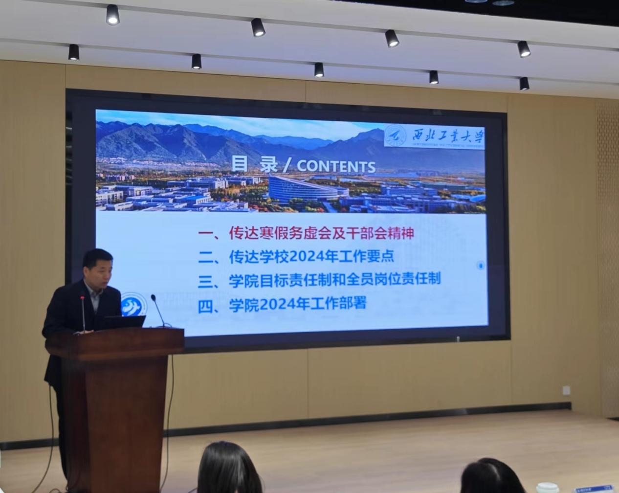 孙瑜首先介绍了新一届领导班子具体分工,随后介绍了新学期学院工作思路要点并部署重点工作。她强调,学院围绕学校“强特色、筑高峰”的总体发展思路,聚焦学校“总师型”人才培养的具体要求,对照学院学科建设、人才引育、科学研究、队伍建设等发展现状,梳理学院发展路径,明确学科发展本体方向,细化工作方案。她要求与会人员要根据学校发展的不同阶段去分析问题,夯实自身教学科研基础,明晰自己的“特色”,实现自己的“高峰”,与学院高质量完成2024-2027年目标责任制任务“同频共振”。