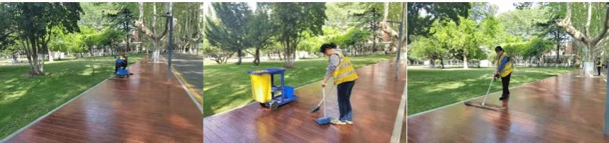 友谊校区教学科研区木栈道已成为校园内一道靓丽的景色。根据春季季节性特点,物业服务中心增加木栈道清洁保养频次至4—6次/每日,并进行巡扫巡拖清理。除日常保洁维护人员外,还设立了四个小组,在特殊天气下进行扫水和铺设防滑毯。