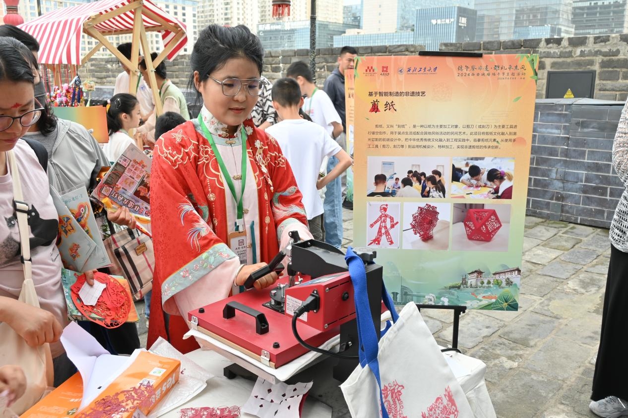 本次活动,依托工程实践训练中心开设的非遗特色艺工融合课程,设置了非遗剪纸、掐丝珐琅画、活字印刷、刺绣、创意彩灯等5个非遗项目互动体验环节,组织陕西省非物质文化遗产传承教育实践基地师生,以“非遗+科技”为特色,将激光切割、3D打印等智能制造技术有机融入非遗技艺传承中,带领游客开展非遗创作沉浸式体验,让游客在动手创作感悟中华优秀传统文化魅力的同时,体验非遗创意设计的时代科技感。